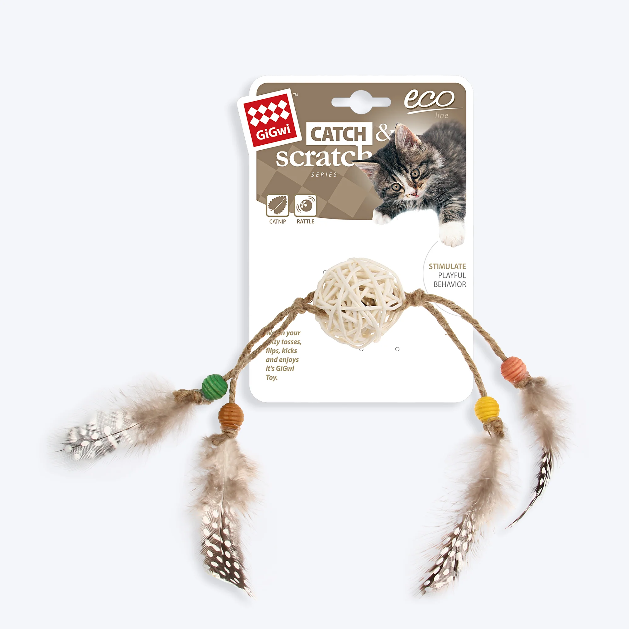 GiGwi Eco Line Catch And Scratch Cat Toy With Rattle Wood Brown Feathers