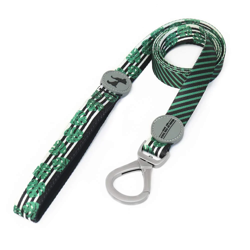 The Be-leaf in Good Dogs Collar and Leash set is ideal for your daily walks. These are made to be super strong with durable nylon tape. Designed for minimum fuss, the collar has a plastic snap buckle and the leash, an easy-to-attach clip. The fresh, tropical leaf print makes it stand out and the leash has a padded hand loop for comfort.