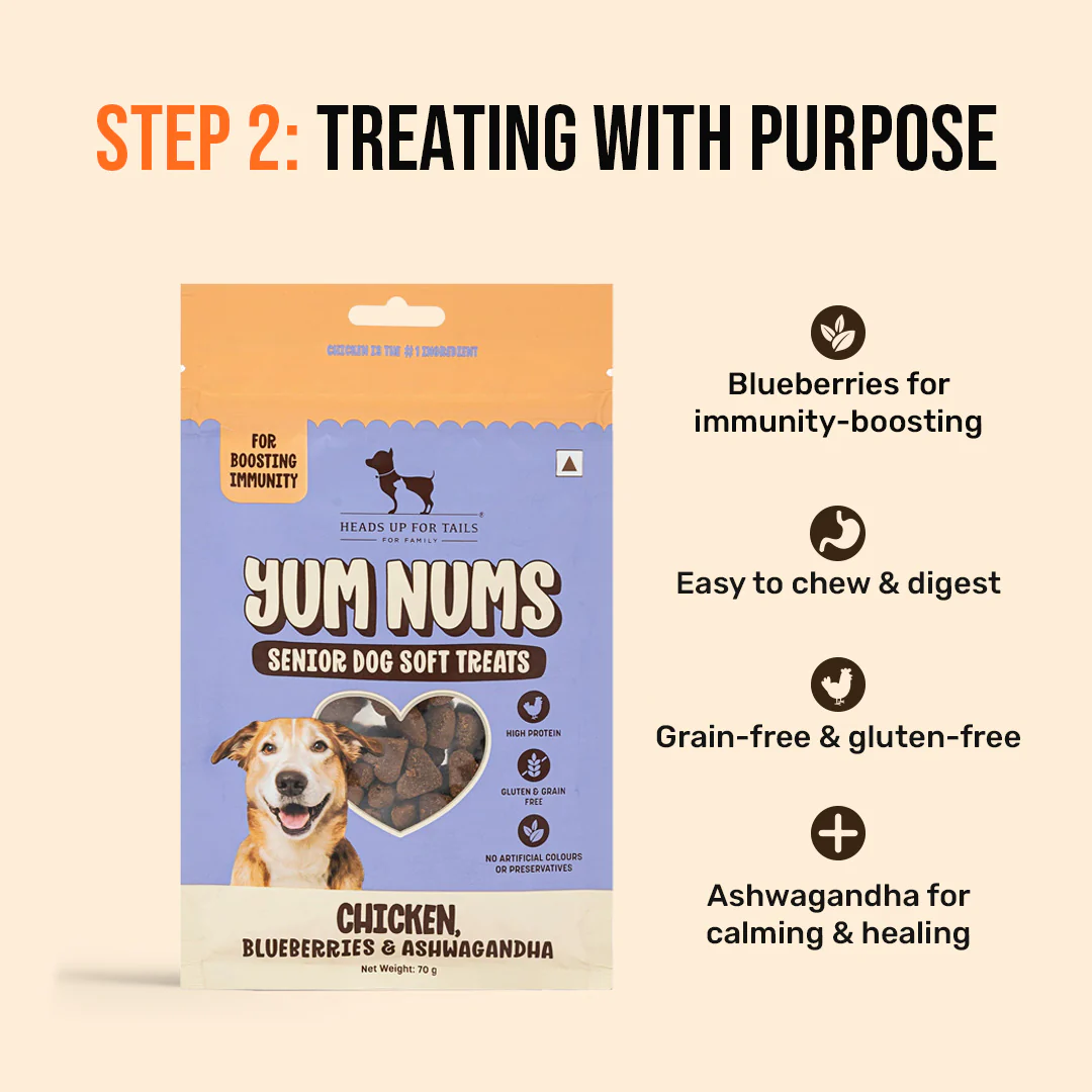 - Yum Nums Senior Soft & Chewy Treats: These easy-to-chew, grain- and gluten-free treats contain superfoods like blueberries for immunity-boosting, and Ashwagandha for its calming and healing properties.