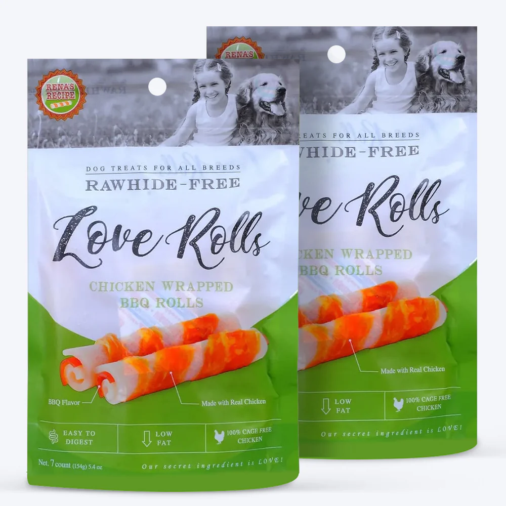 Love rolls are easy to chew, plant-based tapioca chew core. Rawhide free dog treats for all breeds. They are highly digestible and contain very low fat. Rolled with the BBQ layer in the center. It is a handmade treat with a high content of proteins. Tasty option for training rewards and healthy snacks. Made from 100% pure, cage-free chicken.