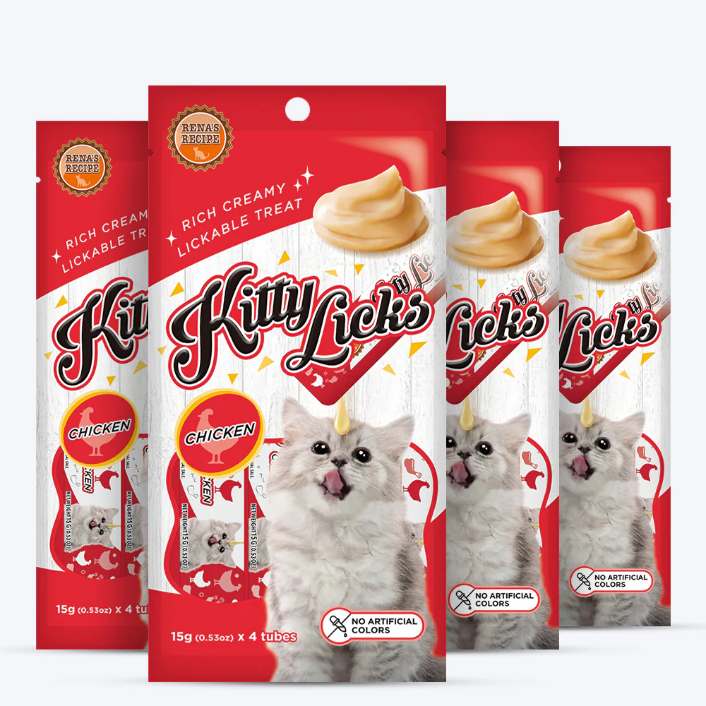 Rena's Recipe Kitty Licks Chicken Cat Treat for all breeds. Made in Thailand. Rich Creamy, Lickable Treat. Tuna with Seafood Flavor. No artificial colors used.