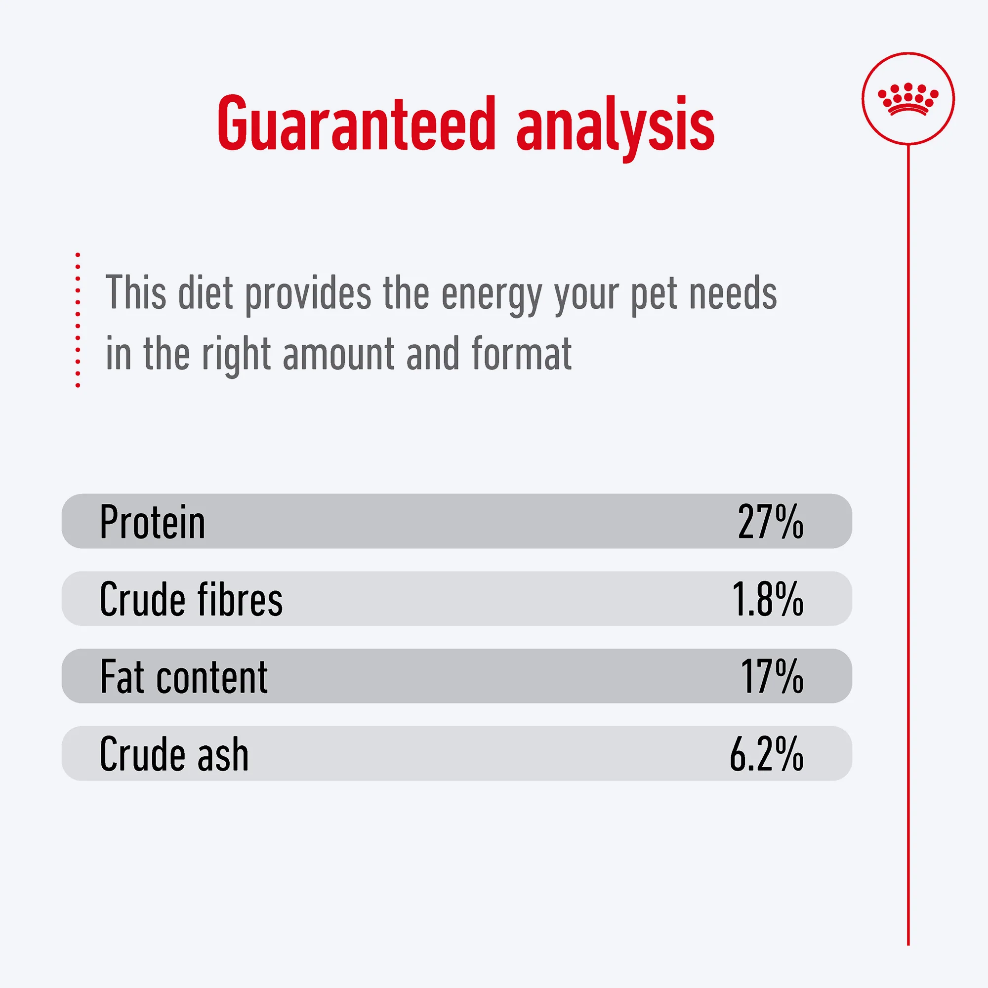 Analytical constituants: Protein: 7.5% - Fat content: 5.5% - Crude ash: 1.5% - Crude fibres: 1.4% - Moisture: 81.0% - Omega-3 fatty acids: 0.1% - EPA and DHA: 0.08%.